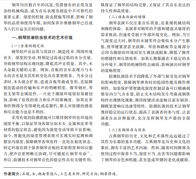 环境因素如温度与湿度变化影响钢琴养护,已然成为音乐艺术领域的议题之一。钢琴被视为精致 的艺术品,需要呈现完美的音色,同时还需具有耐久性和稳定性能。本文主要关注如何利用钢琴防潮防虫技术 来保障琴声的美感,延长使用寿命并保持其艺术价值。文章深入分析了湿度和虫害对于钢琴各个部分的影响, 探究当前防潮防虫技术的发展趋势及其实践运用。