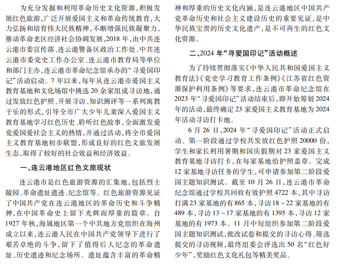 红色旅游作为重要的旅游形式,不仅让人们缅怀先烈、激发爱国热情,而且促进了区域经济和文化 发展。近年来,连云港市挖掘本土资源、提炼精神特质,聚力打造红色文旅品牌———“寻爱国印记”活动,通过寓 教于乐的方式,引导广大少年儿童深入爱国主义教育基地,传承红色基因,推动红色文旅产业高质量发展。