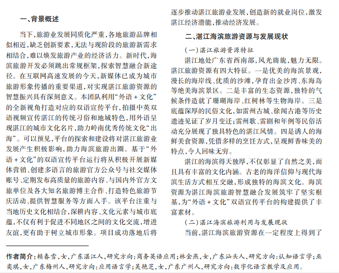 随着全球经济发展动力不足,经济下行压力加剧,旅游业成为破解经济困境的有力途径。本文提 出构建“外语 +文化”双语宣传平台,以新媒体推广湛江特色,旨在打造旅游新名片,促进对外开放,激发经济活 力,推动乡村振兴,探索旅游业创新驱动发展的新路径。