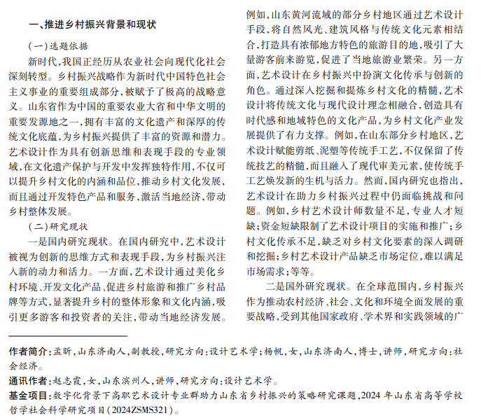 乡村振兴需要大量具有专业技能和创新精神的人才。高职艺术设计专业群作为职业教育的重要 组成部分,在乡村振兴中发挥重要作用。本文分析乡村艺术设计对促进乡村建设的重要意义,剖析山东省高职 艺术设计专业群助力乡村振兴的现状,探索在数字化背景下高职艺术设计专业群助力乡村振兴的对策。