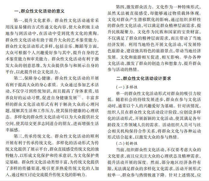 群众文化起源于当地传统风俗及民间文化,是大众社会文化生活的重要组成部分,对社会发展具 有重要作用。本文阐述群众性文化活动开展的意义,探讨多样性、创新性、广泛性的群众性文化活动设计要求, 提出结合地域特色、完善服务体系、创新活动形式等实践措施。