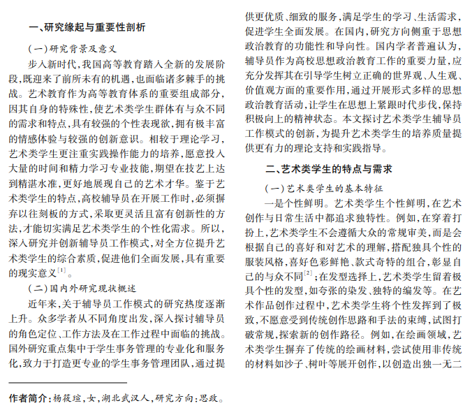 随着社会快速发展,艺术类学生群体展现出独特需求。本文通过剖析艺术类学生个性鲜明、情感 丰富、创造性强、实践能力突出等特征,研究当前辅导员工作模式单一对学生发展的不利影响,提出个性化辅 导、情感关怀、创新能力培养和实践能力强化等创新策略,通过案例分析验证策略效果,旨在增强辅导员工作有 效性,促进艺术类学生全面发展。