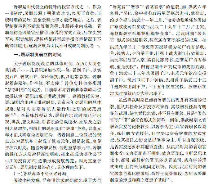 明代设立了与实职官相对的署职官,形成了独具特色的署职制度。所谓“署职”,指明代在授予部 分官员官职之前,先授以“署职”,为虚衔,作半级,不支俸。署职一般是在原职(实职)基础之上授任,主要因缺 而设。从官职来看,明代文武阶层都有署职,文官以郎中、员外郎为主;武官以署佥事一职最典型。