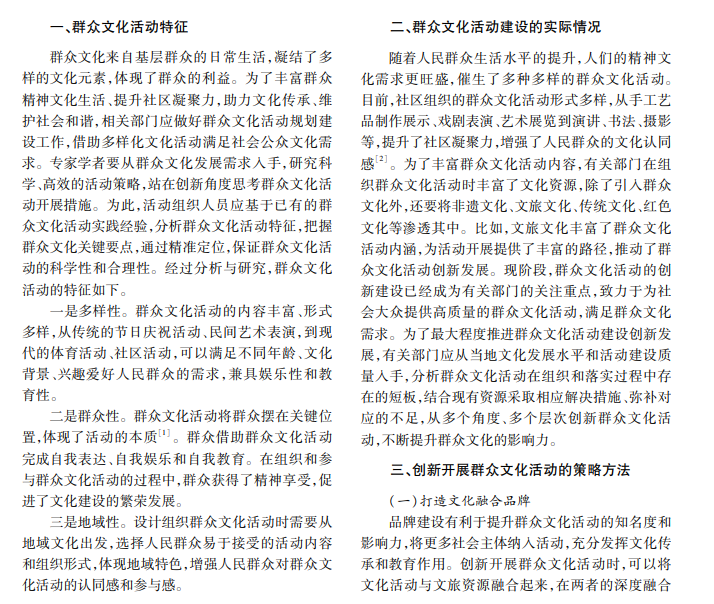 群众文化活动满足了人民群众的精神文化需求。本文介绍群众文化活动的基本特征,分析当前群 众文化活动建设的实际情况,最后从品牌建设、设施利用、资源整合、主题设计、形式规划、活动节点、评估改进 等方面分析并研究创新开展群众文化活动的科学策略和方法。