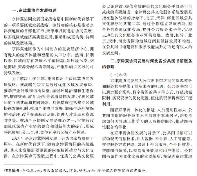 京津冀协同发展包含文化协同发展,三地公共文化服务机构需加强沟通交流,加强优质公共文化 设施建设,提升公共文化服务效果。在此背景下,公共图书馆服务体系建设面临新的挑战和机遇。本文阐述河 北省公共图书馆服务效能提升面临的机遇、挑战和新要求,研究提升公共图书馆服务效能的策略。