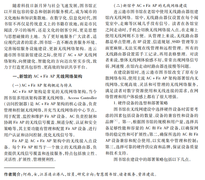 本文对比分析连云港市图书馆老馆和新馆无线网络覆盖模式,提出依托 AC+AP覆盖模式的全新 无线网架构与图书馆创新服务的内在关系,借助后者,图书馆实现了营造安全便利的无线环境以及实施多样化 的移动信息服务。