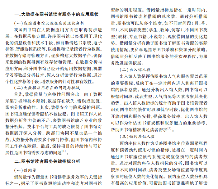 随着信息技术进步,大数据分析在图书馆服务中的应用愈发重要。大数据分析显著提升了图书馆 服务质量,但仍面临数据处理、安全和人员培训等问题。本文分析大数据在图书馆服务中的应用现状及关键指 标,提出优化策略。