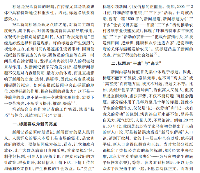 本文阐述报纸新闻标题的重要性,认为标题是报纸新闻的眼睛,好的标题可以吸引读者,使读者迅 速了解新闻内容,发挥舆论引导的积极效果。“吸睛”的标题打破固化思维模式,注重修辞方法妙用,能显著提 高新闻的感染力。