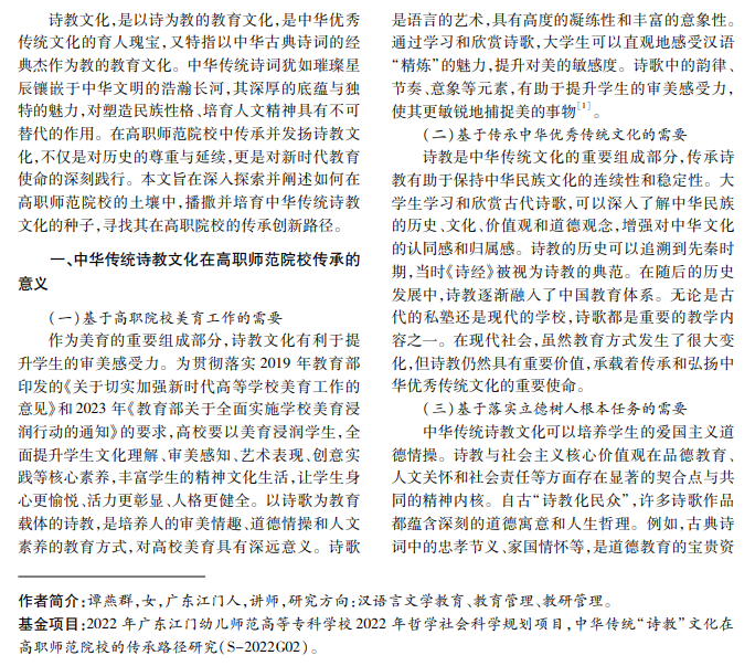 本文聚焦中华传统诗教文化在高职师范院校的实践探索,阐析中华传统诗教文化对美育工作的意 义,研究中华传统诗教文化在高职师范院校的传承发展对大学生核心素养和职业素养养成的作用,探索中华传 统诗教文化的数字化传承策略和实践路径,以提升师范生文化素养,塑造师德师魂,实现立德树人根本目的。