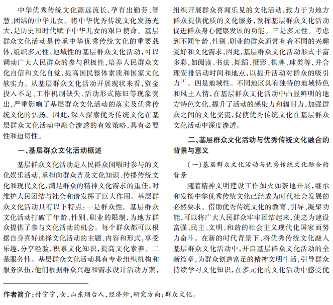 优秀传统文化与基层群众文化活动相结合,有利于促进基层群众文化活动长效创新发展,促进中 华优秀传统文化传承和创新,提高国民文化素质,达成精神文明建设目标。本文论述基层群众文化活动的概念 和特点,分析基层群众文化活动与优秀传统文化融合的背景与意义,并提出融合渗透策略。