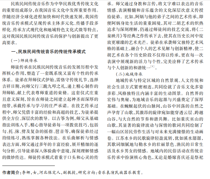 民族民间传统音乐是中华优秀传统文化的重要组成部分,承载各民族的历史、文化与情感,具有不 可替代的价值。目前,民族民间传统音乐传承模式包括师徒传承和地域传承两种模式。社会快速发展给民族 民间传统音乐传承带来了巨大冲击,亟须创新传承模式,推动其不断发展。基于此,本文分析民族民间传统音 乐的传承模式与创新发展路径。
