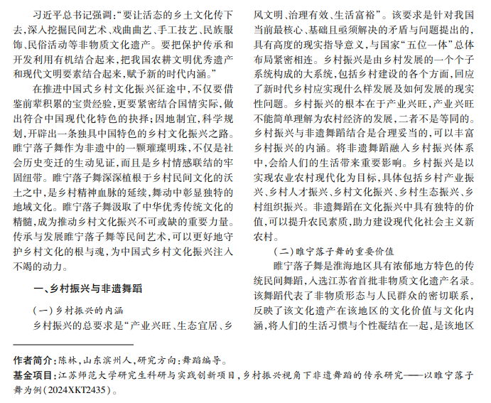 非物质文化遗产(以下简称“非遗”)指各族人民世代相承的、与生活密切相关的各种传统文化表现 形式,包括实物和场所。在全面推进乡村振兴战略背景下,非遗文化为乡村注入发展潜力,乡村振兴让非遗传 承更富活力。本文以睢宁落子舞为例,介绍睢宁落子舞的传承情况,以及非遗舞蹈和乡村振兴融合发展的问 题,提出非遗舞蹈传承创新的路径,使其在乡村振兴中发挥重要作用,弘扬优秀传统文化,建设文化强国,推动 乡村振兴。