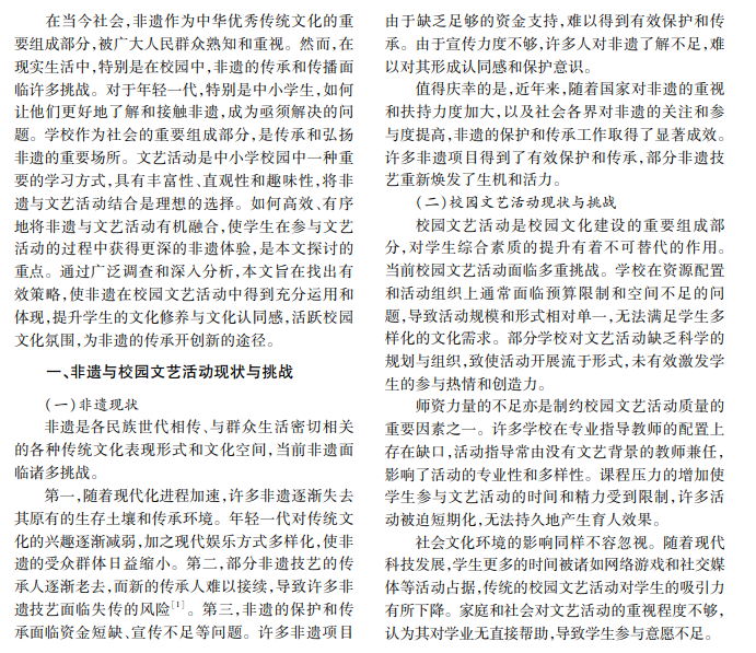 本文通过对多所学校开展调查研究,发现引入非遗可以让学生获得深度文化体验,激发学习兴趣; 通过分析非遗进校园的意义、现状及面临的挑战,提出非遗与校园文艺活动融合发展的策略,为非遗保护传承 提供新思路。