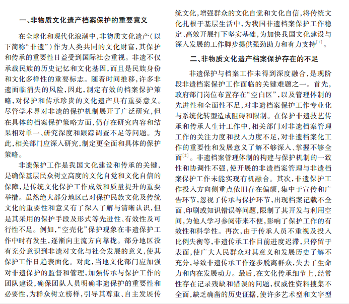 非物质文化遗产是民族文化的瑰宝。随着经济社会发展和文化建设深入,非物质文化遗产档案保 护工作愈加重要。本文探讨非物质文化遗产档案保护的重要性及当前工作中存在的不足,并提出非物质文化 遗产档案保护策略。