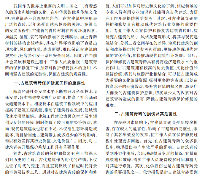 在漫长的历史发展中,我国建造了大量古建筑,对古建筑开展研究可以加深对历史与文化的认识。 近年来,研究人员发现古建筑青砖在外界环境、人为因素影响下出现了损害,难以保证古建筑的完整,削弱了古 建筑的观赏性,古建筑青砖的保护修复工作变得越来越重要。本文围绕古建筑青砖的保护修复技术展开分析。