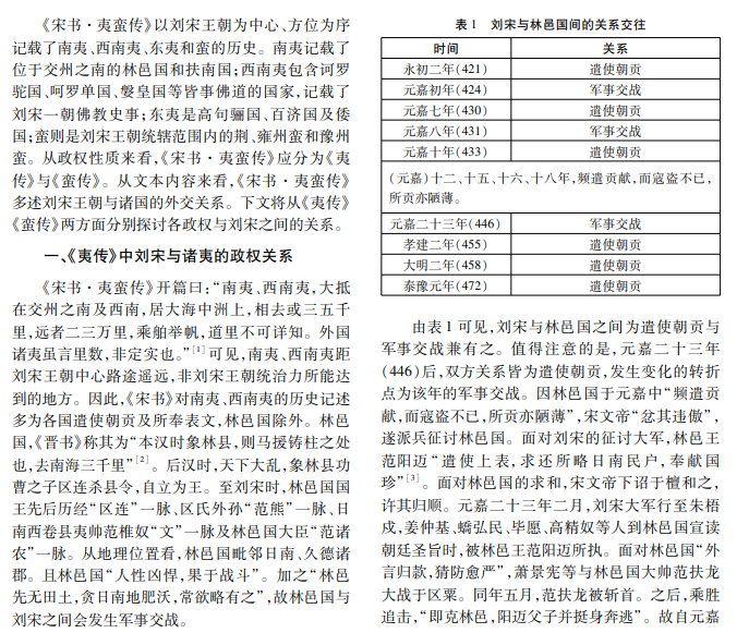 《宋书·夷蛮传》是记述海外诸夷与境内刘宋王朝交往关系的传记,是研究当时中外关系的重要史 料。根据《宋书·夷蛮传》所载政权性质,可将其分为《夷传》《蛮传》两部分。《夷传》所载海外诸夷的政权性质 为国家,其与刘宋王朝之间属于外交关系。《蛮传》所载诸蛮是王朝统辖范围内不著户籍、不服徭役的人群,其 与刘宋王朝往来更密切,关系也更多元化。