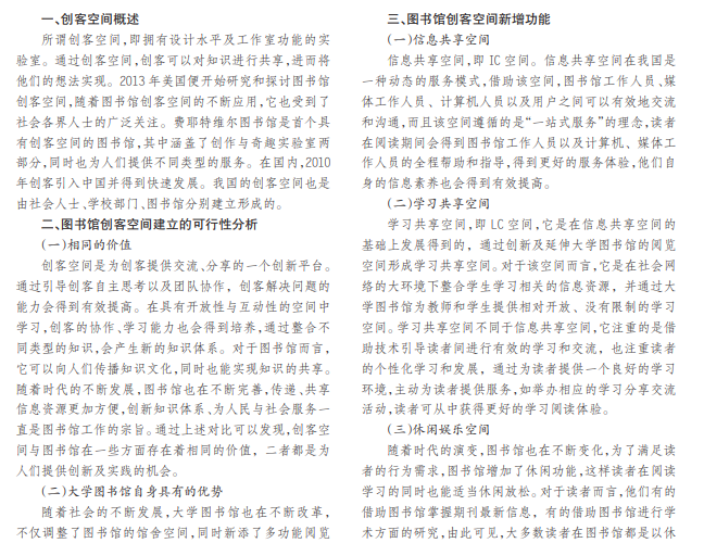 创客空间作为图书馆全新组织形式与服务平台之一,成为图书馆创新发展与升级转型的关键策略和途 径。创客空间的建设,能够培养大学生优秀的创新意识、能力和思维,对学生未来发展与创业就业奠定重要基础,并提供 广阔空间。高校图书馆应对创客空间发展建设予以充分关注和重视,并做好创客空间服务工作,为学生未来发展提供可 靠保障。本文从简述创客空间的发展入手,通过对大学图书馆创客空间建设的可行性分析及空间利用新增功能的阐述, 提出图书馆创客空间建设的对策探讨。