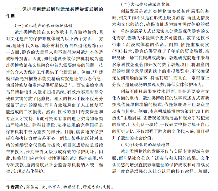 本文从保护与创新发展两个维度出发,以敦煌莫高窟、秦始皇兵马俑等实际案例为切入点,探讨文 旅融合视域下遗址类博物馆保护与创新发展的实践路径,为遗址类文化遗产可持续发展提供新的思路与借鉴。