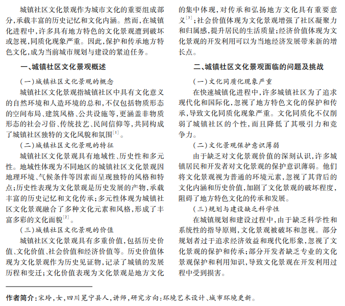 随着城镇化进程加快,在城镇社区文化景观建设中如何保护和传承地方特色,成为当前城市规划 与建设的重要议题。本研究通过案例分析、实地调研和理论研究相结合的方法,提出具有可操作性的更新策 略,以期提升城镇社区文化景观品质和文化价值,促进社区可持续发展。