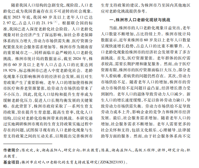 随着人口老龄化加剧,株洲市面临劳动力市场供给不足、医疗资源紧张和社会服务需求增加等挑 战。本研究通过文献综述、数据分析和案例研究相结合的方法,分析株洲市实施的生育支持政策及其对缓解人 口老龄化的影响,探讨政策实施效果及存在的问题,提出改进建议,以期提高政策有效性,促进株洲市人口长期 均衡发展。