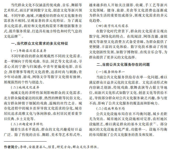 随着经济快速发展和人民生活水平不断提高,当代群众对精神文化的需求日益增长,呈现多元 化、个性化的特点。本文结合当代群众文化需求的多元化特征及当前公共文化服务存在的问题,深入探讨当代 群众文化需求的多元化与满足路径,以期实现文化产业的转型升级和可持续发展。