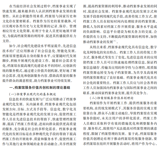 档案馆作为档案管理的重要机构,承担社会职责,发挥服务职能。本文围绕档案馆服务价值共创 机制展开分析和论述,提出实现服务价值共创的有效路径,希望为从业人员提供参考和帮助,推动档案事业发展。