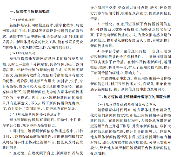 本文以新媒体与短视频的概念为切入点,简要阐述地方媒体短视频新闻影响力、短视频新闻信息 制作方面存在的不足,提出做好视频内容制作、创新新闻工作方式、强化培训等针对性策略,旨在为地方媒体短 视频新闻传播优化提供参考。