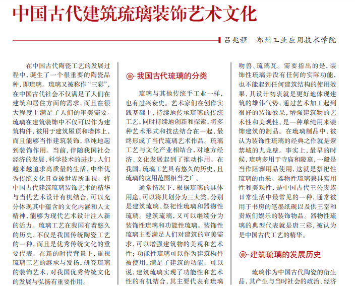 中国古代建筑装饰 艺术有漫长的历史,具有 深厚的文化底蕴。许多 建筑装饰兼具形态美和 实用性,与时代审美价值 和社会观念密切相连,是 研究中华民族优秀传统 文化和审美观念的重要 途径。琉璃工艺是我国 传统工艺和优秀文化的 重要代表,研究琉璃制作 工艺,有利于了解建筑琉 璃装饰背后蕴含的文化 内涵,推动我国传统优秀 文化的继承与发展。