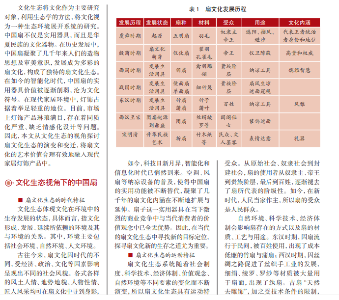 扇文化是中国传统文化中的一种民俗文化,其以扇子为载体,体现中国文化的魅 力与美感。将扇文化融入现代家居灯饰中,既传承了扇文化的内涵,又借扇之形,传 物之趣,为扇文化研究和灯饰设计提供了全新的视角。