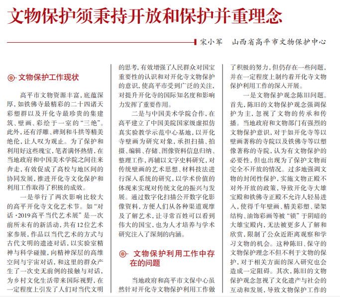 近年来,山西高平开化 寺因其独一无二的壁画艺术 造诣、铁佛寺因其精美绝伦的 彩塑艺术一度引起美术界的 关注。围绕开化寺、铁佛寺的 学术研究和活化利用也取得 了较大的发展。但是高平的 文物保护工作目前还存在诸 多问题,诸如文物保护机制不 完善、文物保护资金不足、文 物保护力度不足等,掣肘高平 文物事业的发展,急需协调 解决。