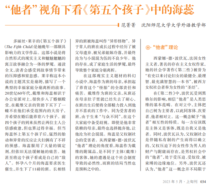 多丽丝·莱辛,英国 女作家,2007年度诺贝尔 文学奖获得者。其作品 《第五个孩子》(The Fifth Child)通过对班(Ben)一 家人物形象的塑造,向读 者展示了一个有着畸形 关系的英国中产阶级家 庭。莱辛借小说中重点 人物在父权制社会环境 下的人物关系以及小说 冲突所产生的原因,表达 对女性权利的渴望。