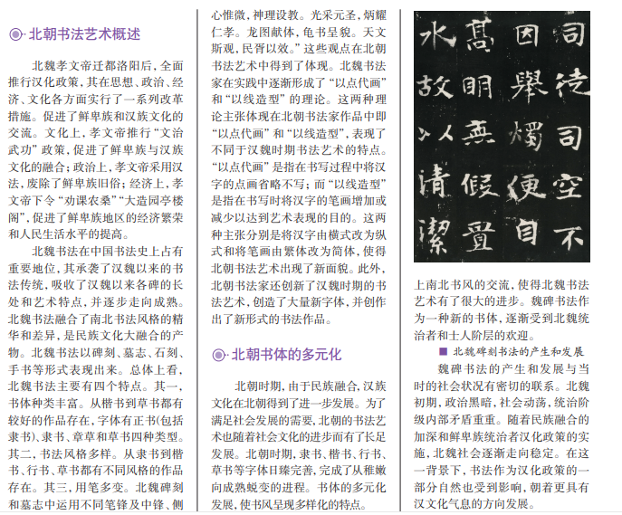 北朝是少数民族统治的北方地区,政权更替频繁,但没有大统一。北方地区保留 了鲜卑族旧俗,对书法艺术产生了一定的影响。北魏时期碑刻和墓志的大量使用为书 法艺术的发展奠定了基础,而北方地区北魏统治者提倡民族融合,实行汉化政策,使 得北朝书法艺术在很大程度上受到汉族传统文化的影响。