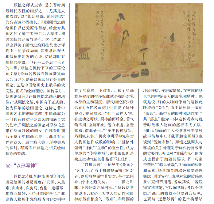 形神论思想起初是一个哲学概念,先秦时期已在诸子讨论范畴。魏晋六朝时期, 中国古代文学艺术步入自觉发展的时代,文学、艺术开始有了独立的审美价值,艺术 创作渐渐具备了清晰的发展脉络。专业的艺术理论也肇端于这个时期。形神论思想 延伸到文学、艺术领域,与相关理论和作品碰撞融合,在其中继续得到阐发,在新的发 展方式下呈现新的面貌。