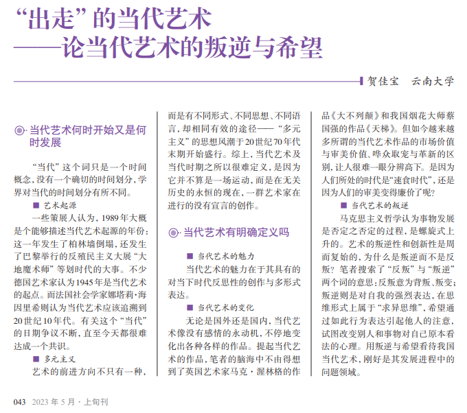 艺术的前进方向 并非只有一种,而是有 不同形式、不同思想、 不同语言,却相通的途 径。伟大的艺术可以 跨越时间、地域、种族, 但超越不了艺术家背 后的文化观念。艺术 创新要贴合生活。在 我国,艺术不仅是传统 的也是现代的,当代艺 术作品的发展需要与 世界未来潮流接轨融 合,而且要体现我国高 度的文化自觉与文化 自信。
