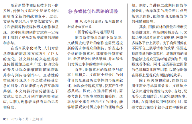随着科技的发展和传播方式的多样化,传统的文字叙述方式已经无法满足现代 社会对历史的理解和传播需求。在新传播形态下,需调整与适应文献历史纪录片的创 作思路,以实现超越文字的多媒体叙事。