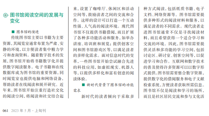 新时代图书馆的功能不再局限于传统的书籍存放和阅览,而更注重为读者提供 多样化的服务和体验。图书馆阅读空间创新旨在满足读者的阅读需求、促进知识的交 流、增强图书馆的文化氛围和功能。随着电子书的普及和数字资源的充实,人们的阅 读习惯发生了改变。传统的图书阅读空间已经无法满足现实需求。因此,图书馆阅读 空间创新建设显得尤为重要。