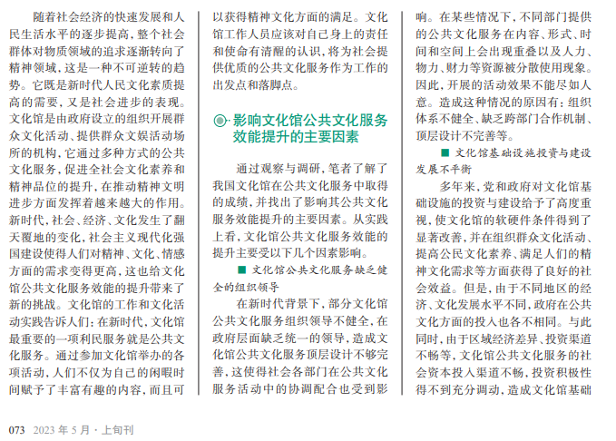 政府设立的文化馆是 开展具有文化性质且不以 营利为目的开展公共文化 服务活动的重要场所。在 新时代背景下,文化馆的公 共文化服务效能发挥遇到 了瓶颈。文化馆工作人员 应明确新时期文化馆公共 文化服务的特点、内涵和社 会价值,掌握影响文化馆公 共文化服务效能提升的主 要因素,坚持改革创新的理 念,探索立足新时代的文化 馆公共文化服务效能提升 策略,助力文化馆公共文化 服务效能的提升。