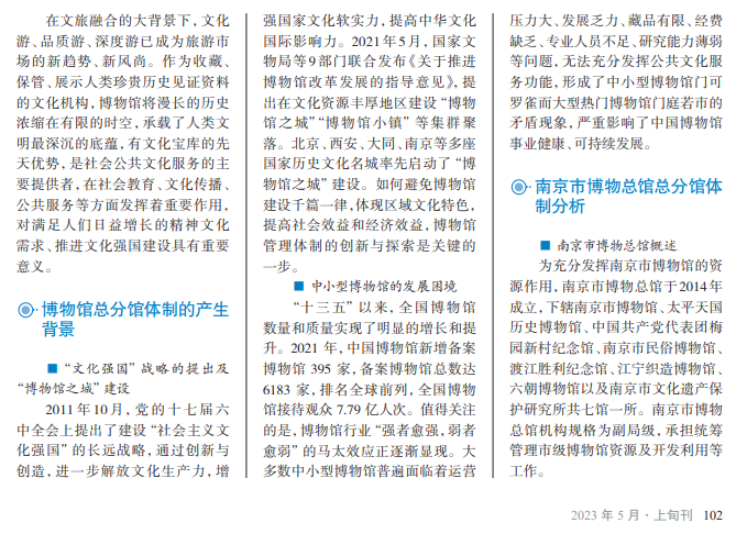 博物馆总分馆制是为了突破单一模式、弥补分馆短板、加强文化文物资源的共建 与共享、提高公共服务效能而进行的积极探索。探讨总分馆体制下博物馆行政管理中 职权履行存在的问题和职能转变的方向,可以更高效、更深入地推进行政管理体制改 革在具体微观层面的落实,促进博物馆多元包容、协同发展。