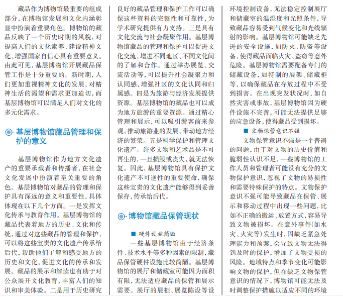基层博物馆作为传承和展示文化遗产的重要载体,在文物保管工作中扮演着重 要角色。如何在现有条件下,实现藏品的科学保管和传承,成为基层博物馆迫切需要 解决的问题。针对藏品保管工作中存在的问题,基层博物馆应通过制度化、技术化、 科学化的手段,确保文物的长期保存和传承,提高藏品管理保护工作效率。