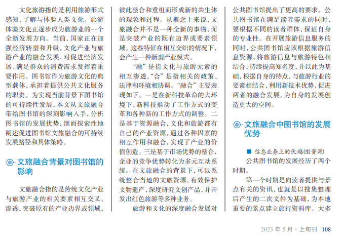 文旅融合是促进社会高质量发展的重要推动力,近年来在公共文化服务体系中 发挥着越来越重要的作用。图书馆作为公共文化服务体系中的主体项目,承担着提供 文化服务的重要义务,需在明确自身发展定位和方向的基础上,充分发挥地方性馆藏 特有的资源优势,推动可持续发展。
