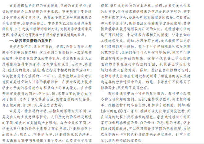 随着我国教育的不断改革,为保证小学生德、智、体、美、劳全面发展,新课标要求小学美术的教学活动中要 重视美育的渗透。对此,本文针对小学美术教育中的审美情趣培养展开探究,力求培养小学生的审美能力。