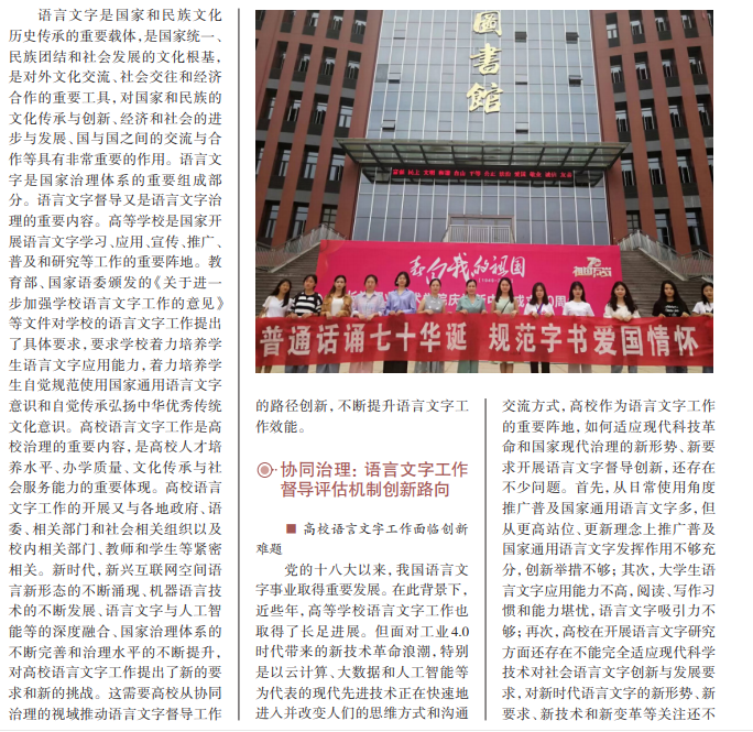 语言文字督导评估工作要创造性地吸收协同治理的基本理念,突出多元主体性、 互动性、规则共同制订、动态性等。高校是语言文字督导评估工作的重要参与者,在 繁荣语言文字事业中发挥着举足轻重的作用。