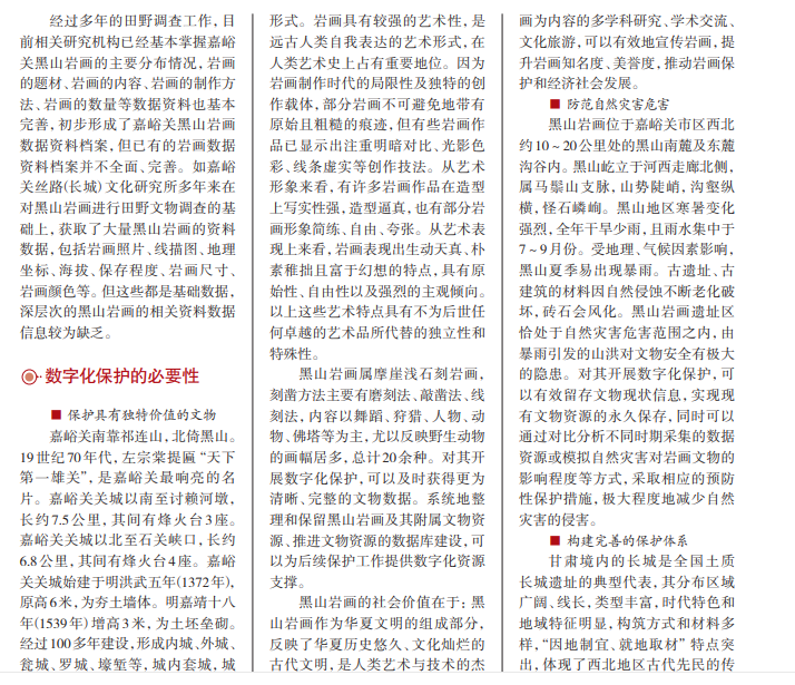 近年来,随着科学技术水平和信息化水平的不断提升,数字化技术在文物保护中得到广泛的应用, 提高了文物保护效率。甘肃省嘉峪关市黑山岩画作为北方岩画极具代表性的岩画,通过数字化技术保存 本体信息,深化研究成果,展现传承价值,是十分重要且有效的保护措施。