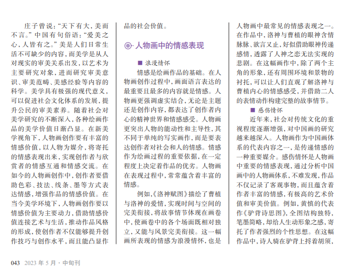 人物画的核心在 于以人物为媒介、为 依托,表达情感、发散 情感。随着人们对艺 术作品的情感价值的 要求越来越高,人物 画的创作方向也应当 有所改变。创作者要 立足于情感来表现人 物,实现自身与人物 及观赏者的情感互通, 凸显作品的情感价值。