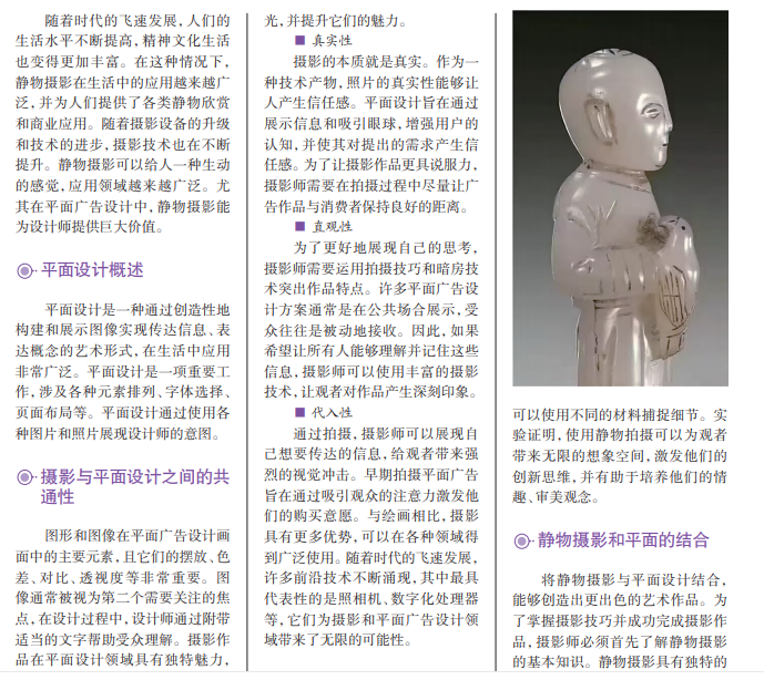 静物摄影注重捕捉人物和环境的细节,运用艺术手段,摄影师可以在拍摄中展现 物体的立体感。将静物摄影应用于平面广告设计中,可以带给观者更真实的感受,凸 显作品的真实性。静物摄影在商业领域的应用越来越普遍。