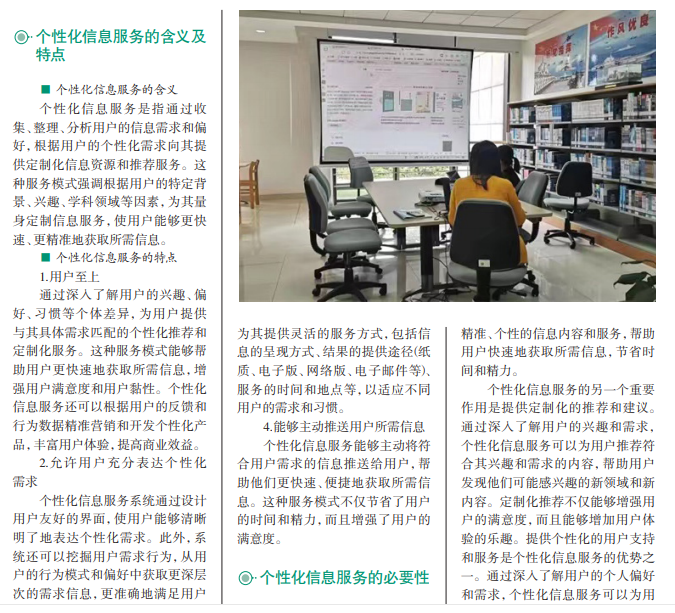 个性化信息服务通过深入了解用户需求,精准推送信息资源,增强用户体验,丰 富图书馆的功能和服务内涵。高校图书馆应深化个性化信息服务,不断探索创新,以 适应时代发展要求,为用户提供优质、便捷、多样化的信息服务。
