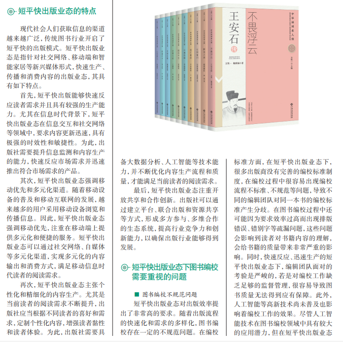 随着阅读需求量的提升、阅读渠道的拓展,传统图书出版业面临着诸多挑战和冲 击。在这种背景下,很多出版社开启了短平快转型模式,以提高市场竞争力。如果为 提高出版效率而忽视出版质量,对出版业的长远发展将非常不利。为此,出版社必须 重视图书编校质量,结合短平快出版业态的特点,不断优化图书编校工作。