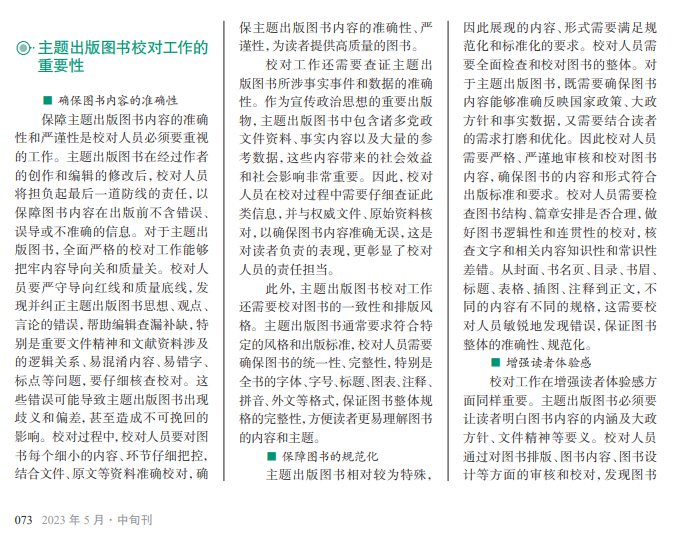 主题出版物是围绕 国家政治、经济、社会、文 化工作大局进行选题策划 和出版的刊物。主题出版 图书不仅提供权威的阅读 服务,而且为社会和经济 发展带来巨大帮助。为了 保障主题出版图书的专业 性,出版社必须做好校对 工作,通过“三校一读”制 度措施,保障主题出版图 书的内容不出差错。