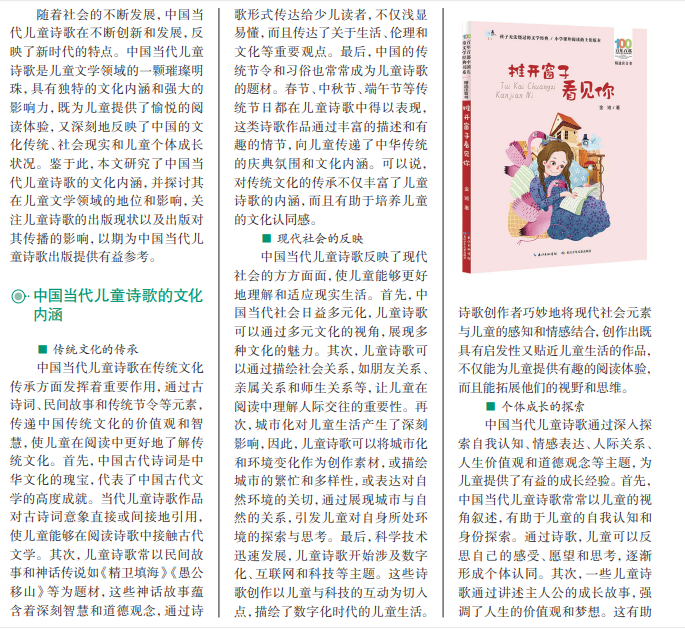 儿童文学一直扮演着为少儿读者传递知识、情感和价值观的重要角色。而儿童 诗歌作为儿童文学的一支,更是以简洁而生动的语言、鲜明的意象、深刻的情感及丰 富的形式,为儿童提供了独特的文学体验。文章从中国当代儿童诗歌的文化内涵入手, 分析儿童诗歌的出版现状,探讨出版对儿童诗歌的影响,以期为中国当代儿童诗歌出 版提供有益参考。