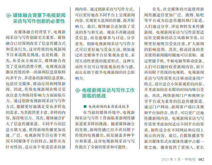 为提升电视新闻节 目的社会影响力,拓展受 众群体,发挥节目的宣传 作用,打造节目品牌,越 来越多的电视新闻媒体 尝试创新新闻采访与写 作方式。在媒体融合时 代,采访者需要掌握更多 的采访、写作技巧和创新 能力,以更好地传达新闻 信息。